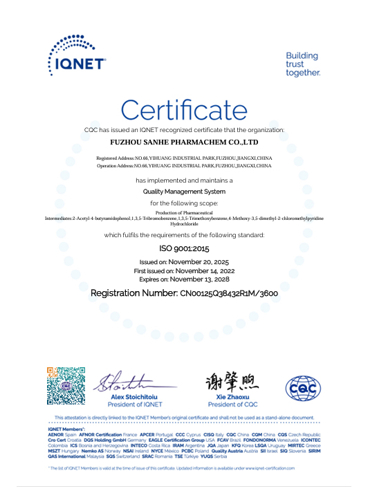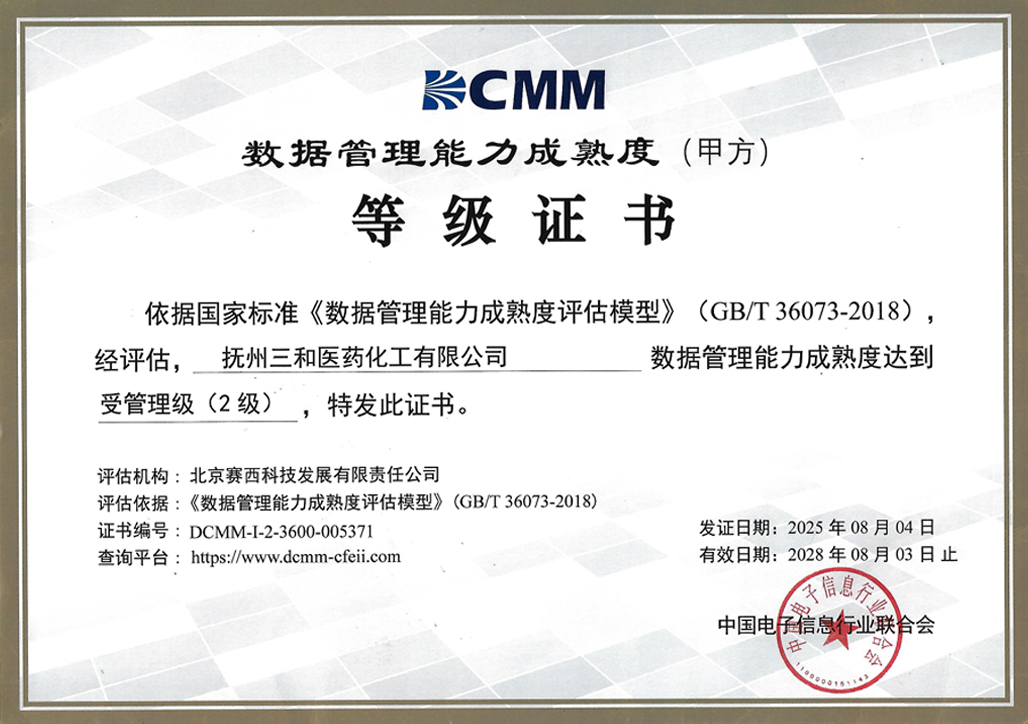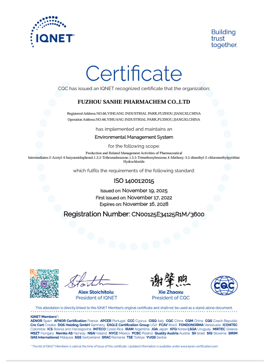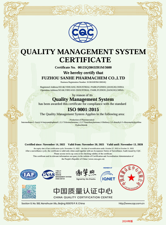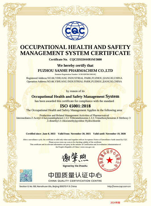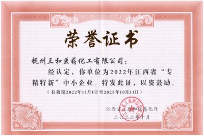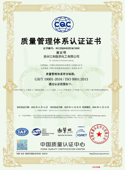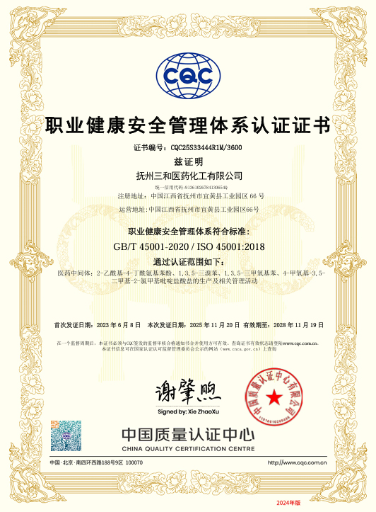 抚州三和医药化工有限公司(简称“抚州三和”)成立于2006年3月,是浙江新三和医药化工股份有限公司的分公司,公司注册资本3000万人民币,总投资2个亿,总占地面积约230亩,是一家主要从事医药中间体产品的研发、生产、经营的健康、安全、环保型民营高新技术企业。截止目前,已建有7个生产车间并已投产使用。并拥有多台不同类型和尺寸的反应设备、离心设备、干燥设备,能够满足生产需求。公司总人数200人, 其中生产人员 110人,技术人员11人 ,设备设施人员24人,EHS16人 , QA人员5人,QC人员13人  ,人员配备充足,有为客户提供优质服务的保障。